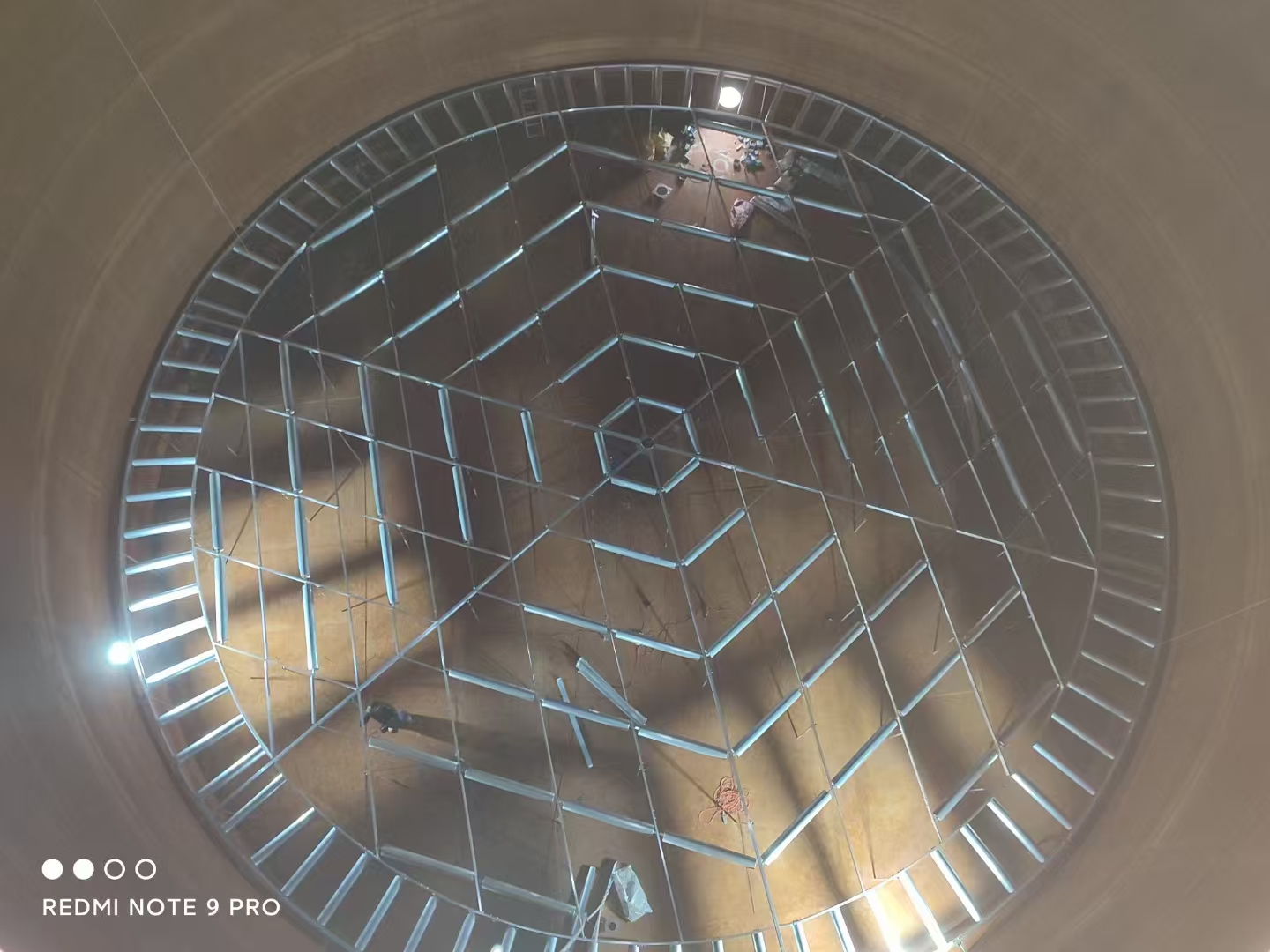 按照材質(zhì)的不同,組裝式儲(chǔ)罐內(nèi)浮頂可分為鋁制內(nèi)浮頂及鋼制內(nèi)浮頂。鋁制內(nèi)浮頂采用仿生蛛網(wǎng)型結(jié)構(gòu),主要用于儲(chǔ)存輕質(zhì)油,例如汽油、航空煤油等;鋼制內(nèi)浮頂材質(zhì)選用304或316L不銹鋼,用于腐蝕性強(qiáng)的液體化學(xué)品的儲(chǔ)罐,多采用井字形結(jié)構(gòu),使用壽命比鋁制內(nèi)浮頂更長(zhǎng),結(jié)構(gòu)強(qiáng)度更大。